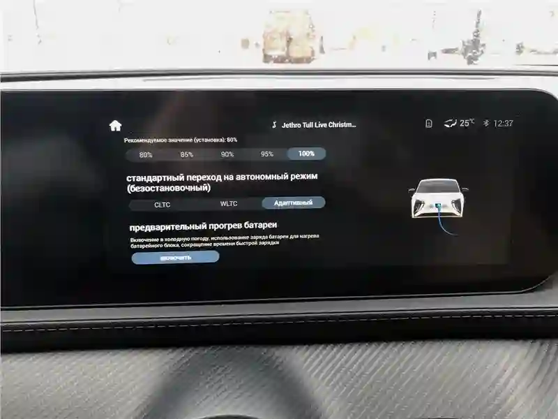 Доступ в машину бесключевой, как и запуск двигателя – да-да, хоть EVOLUTE i‑SKY и электрокар, но кнопка «старт/стоп» на передней панели есть, сев в автомобиль, надо его включить, прежде чем поехать, не как в некоторых китайских «электричках», которые готовы к работе сразу после отпирания – сел на место водителя и сразу можешь включать передачу и нажимать педаль газа. Водительское кресло EVOLUTE i‑SKY с интегрированным в него подголовником, несмотря на вроде бы плоскую подушку и спинку, удобно, у спинки выраженные валики боковой поддержки, регулировок хватает, включая поясничный подпор и регулировку руля не только по наклону, но и по вылету. У EVOLUTE i‑SKY есть полный зимний пакет, подогрев всех сидений, вентиляция передних, а у водительского кресла – еще и пятирежимный массаж. Приятно, что климатическая установка настраивается не через экран, а двумя поворотными «шайбами». Еще у EVOLUTE i‑SKY есть автономный отопитель салона, так что проблема недостатка тепла, которое в машине с ДВС обеспечивает двигатель, а в электромобиле – нет, решена.