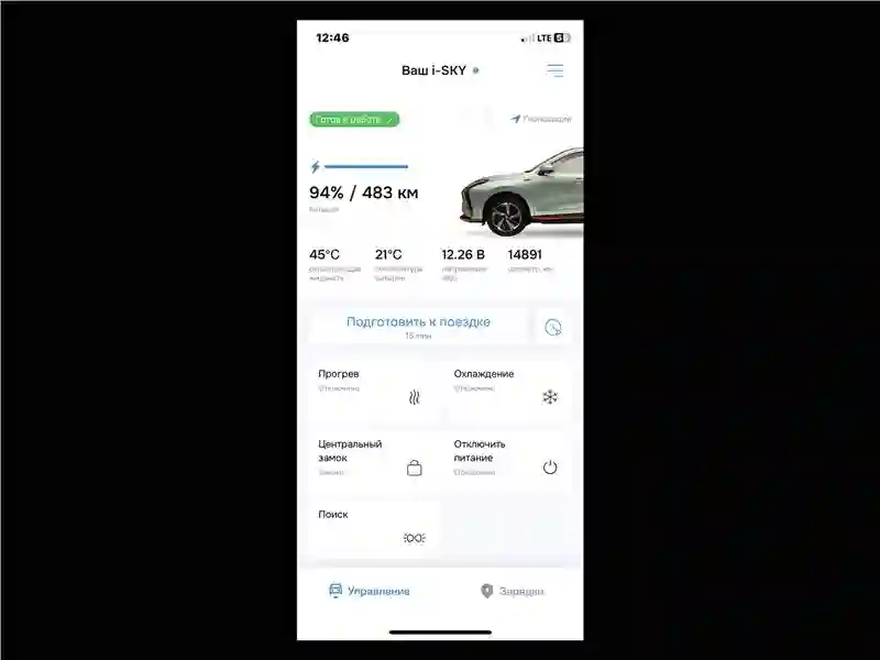Всего у EVOLUTE i‑SKY три режима движения, кроме «спорта» есть еще «эко» и «нормальный». И быстро приучаешься большую часть времени ездить в «эко», Потому что оптимистические 560 с лишним запаса хода при на 98% заряженной батарее – такие данные высвечивались на приборной панели выданного мне в пресс-парке EVOLUTE i‑SKY – в реальности быстро уполовинились. Правда, стоит учесть и использование кнопки «приготовить автомобиль к поездке» на экране смартфона. Да-да, мобильное приложение EVOLUTE не только дистанционно мониторит состояние и местонахождение автомобиля на карте, но и позволяет заранее включить перед поездкой подогрев батареи и салона. Впервые возможность запустить двигатель и прогреть машину на расстоянии перед поездкой я попробовал в 2018 году на Volvo XC60. Сегодня такая возможность есть EVOLUTE – и спасибо ему за это.